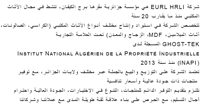 Spécialisée dans l’importation et la production de mobilier de bureau, toutes gammes confondues (sièges, sofas, meubles en mélamine, MDF, verre et métal), l’entreprise commercialise ses produits sous la marque GHOST-TEK, une marque déposée auprès de Institut National Algérien de la Propriété Industrielle (INAPI) depuis 2013.